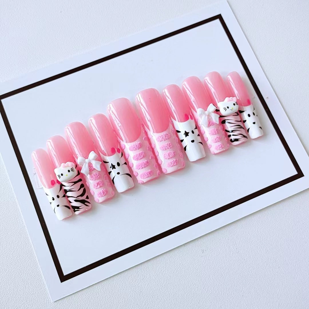 Bright pink kitten Handmade Nails