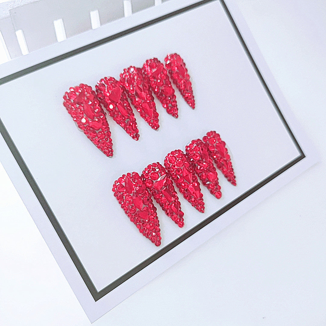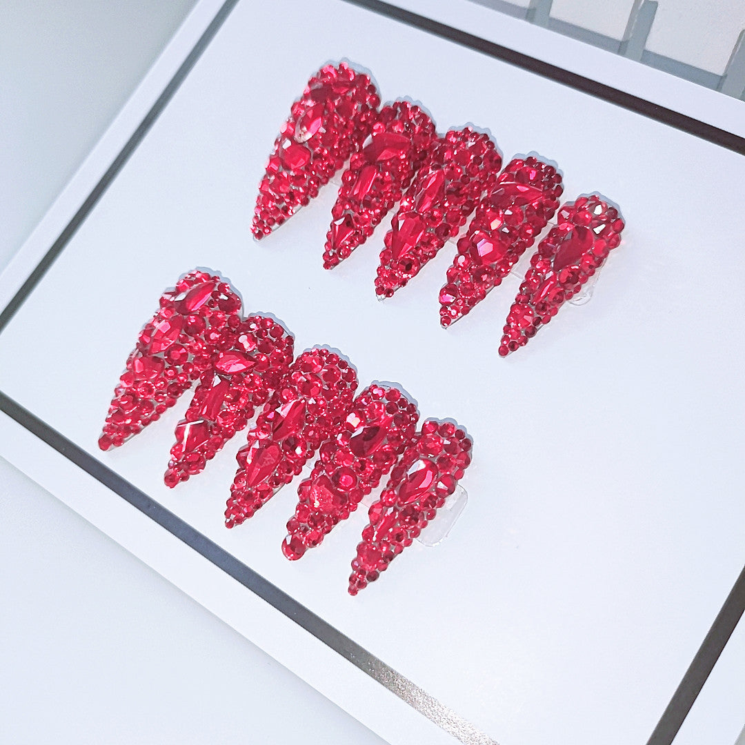 Water Droplet Red Diamond Handmade Nails